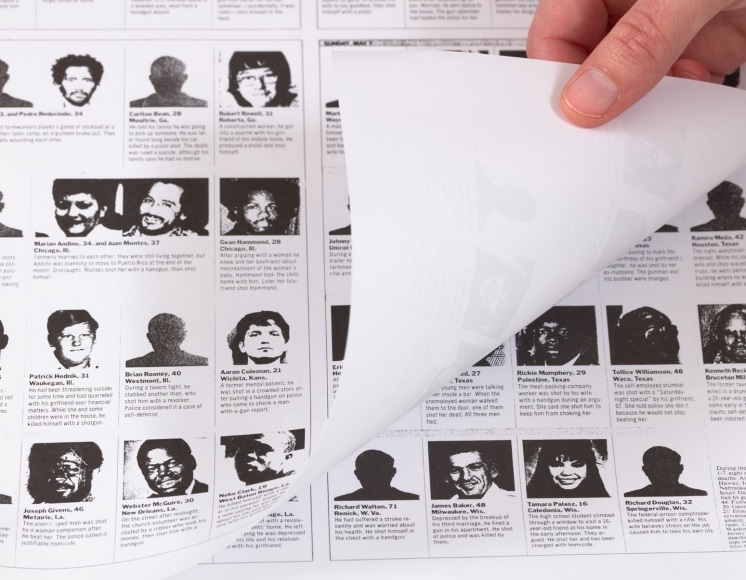 На странице представлены портреты более 100 человек, погибших от огнестрельного оружия в течение недели с 1 по 7 мая 1989 года, а также краткое описание их смерти. Данная работа является призывом против насилия с применением огнестрельного оружия.