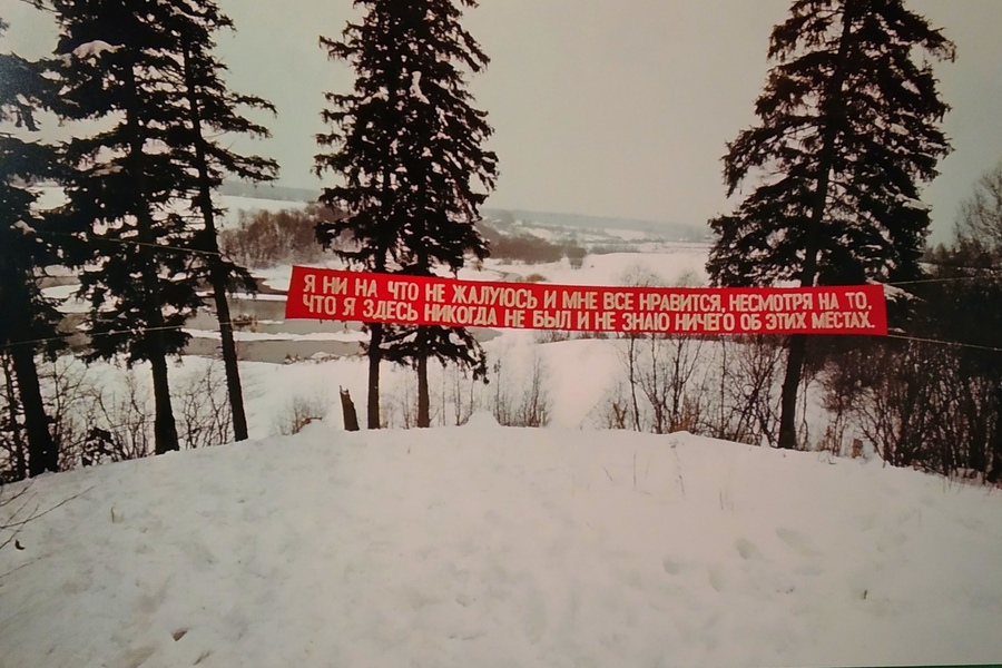 Группа «Коллективные действия» в 1977 устроила акцию в лесу под названием «Лозунг-1977». В лесу между двумя деревьями было повешено красное полотнище с надписью: «Я НИ НА ЧТО НЕ ЖАЛУЮСЬ И МНЕ ВСЕ НРАВИТСЯ, НЕСМОТРЯ НА ТО, ЧТО Я ЗДЕСЬ НИКОГДА НЕ БЫЛ И НЕ ЗНАЮ НИЧЕГО ОБ ЭТИХ МЕСТАХ». Политический лозунг был вынесен на нейтральную территорию леса, контекст пространства по-другому влияет на восприятие идеологического объекта.