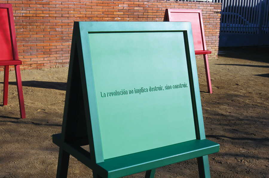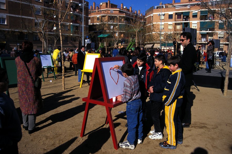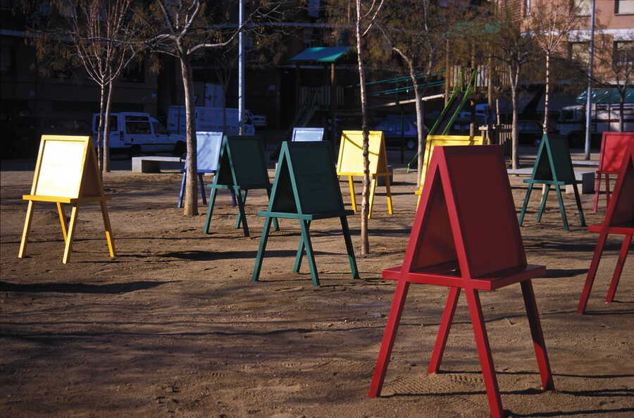 Альфредо Джаар расположил несколько мольбертов перед школой. С ними мог взаимодействовать любой желающий ребенок.
