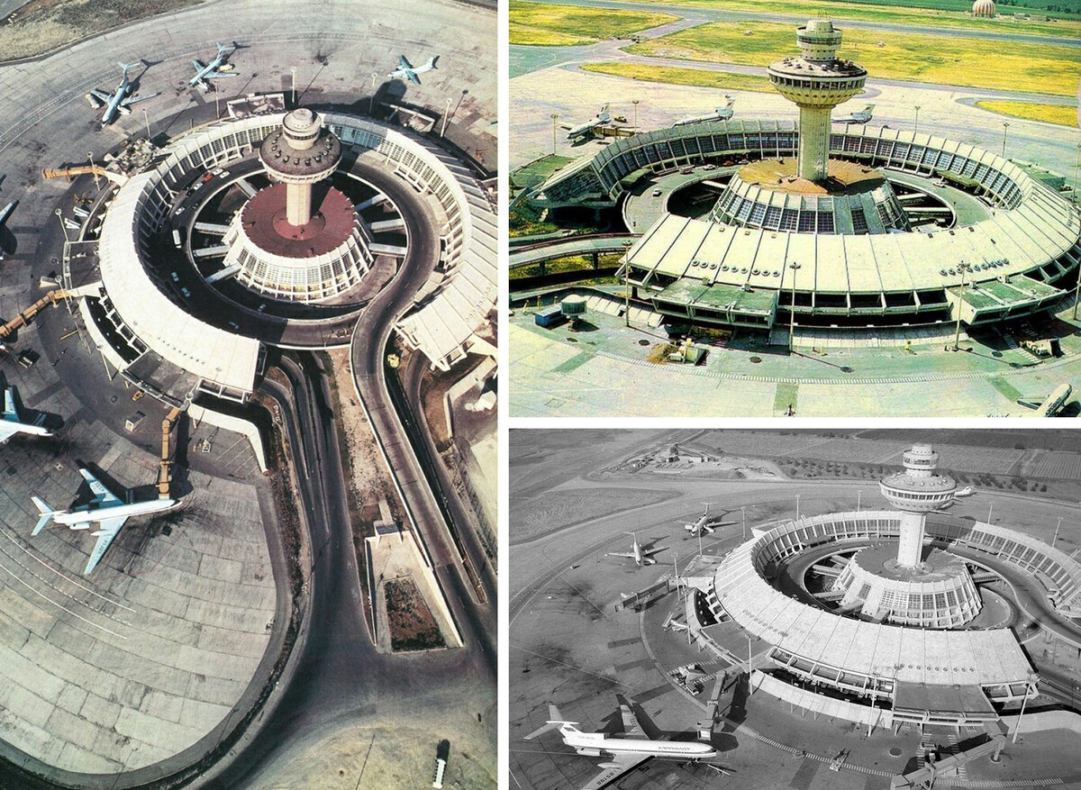 слева: проект расширения и реконструкции аэровокзала, продольный разрез; вид со стороны ВПП. Фото 1959 г. / справа: вид с привокзальной площади; проект расширения и реконструкции, план 1 и 2 этажей.