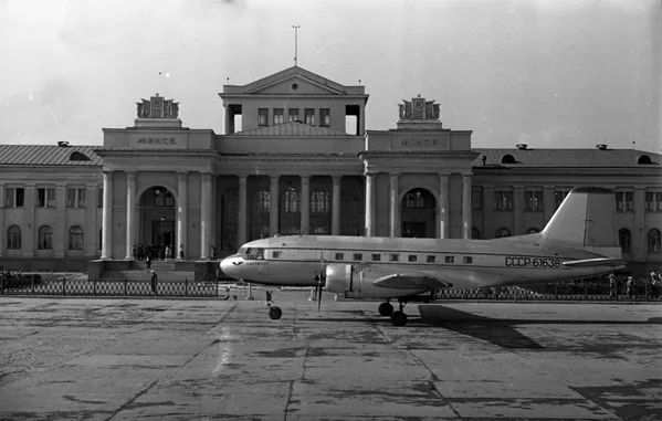 Новое здание аэровокзала «Минск-1». Минск, Белорусская ССР. 1957 г. Архитектор: Г. В. Заборский, А. М. Воинов Пропускная способность: 300 пасс/ч.