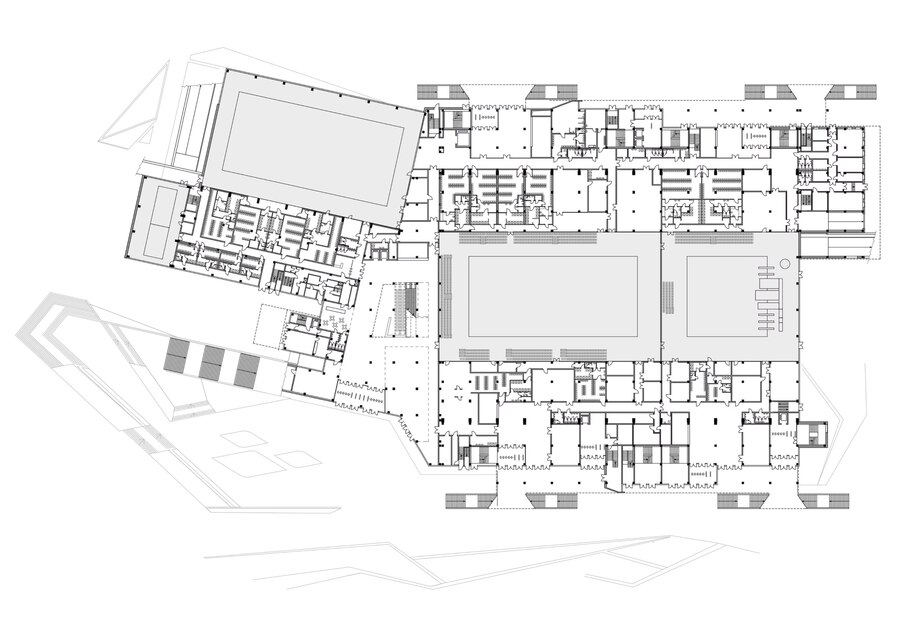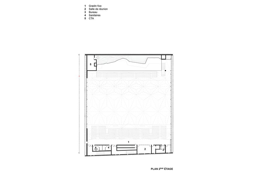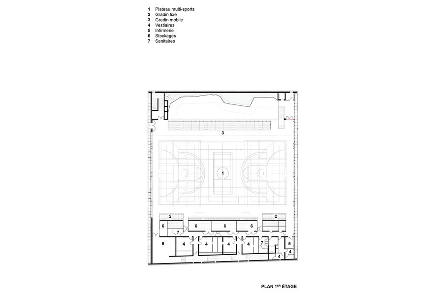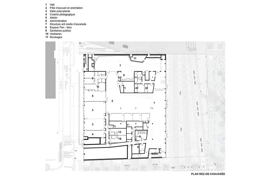 Спортивная зона находится в западной части строения. Главной доминантой является большой игровой зал, за ней располагается скалодром, а также раздевалки, технические помещения, отдельные вход и выход. Зона с культурным блоком преимущественно располагается на 1 этаже, это пространство окружено стеклами, что позволяет проникать солнечному свету внутрь и создавать приятную для творчества атмосферу.