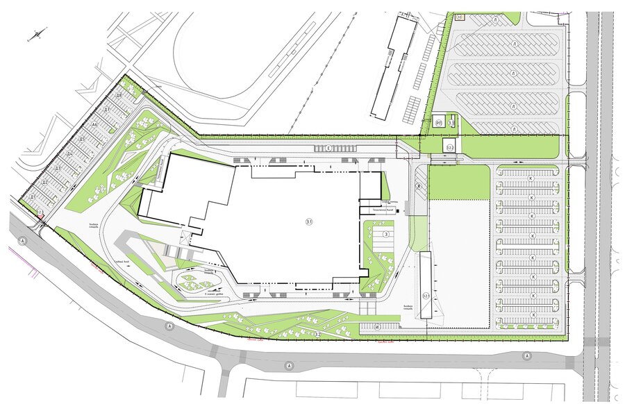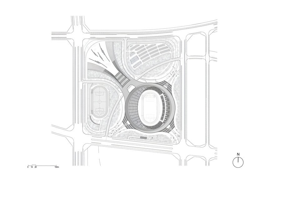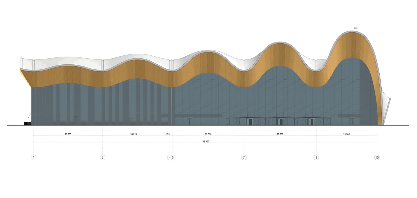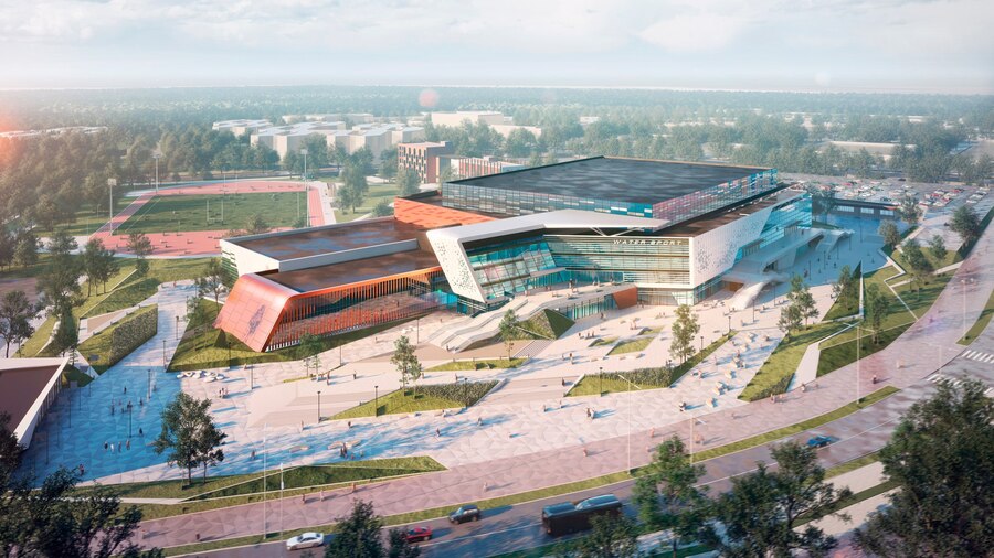 Многофункциональный центр находится в сельском ландшафте. Здесь преобладают холмы, водоемы и зеленые пространства. Архитектура комплекса подчеркивает природные красоты, благодаря своей плавной форме. Внутри находится большое количество помещений как для спортсменов, так и посетителей. Стадион рассчитан на 12 тысяч зрителей, зал — на 3 тысячи, бассейн — на 1,5 тысячи. Вокруг комплекса создана инфраструктура для комфортного пребывания на территории, что превращает многофункциональный центр в спортивно-парковый кластер.