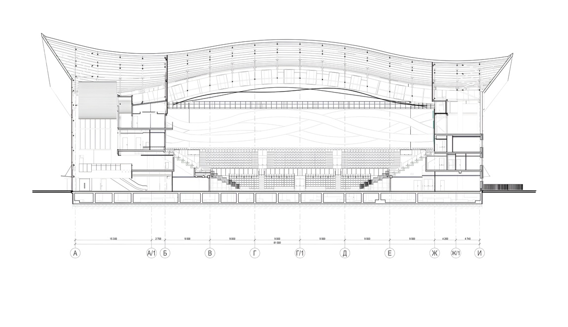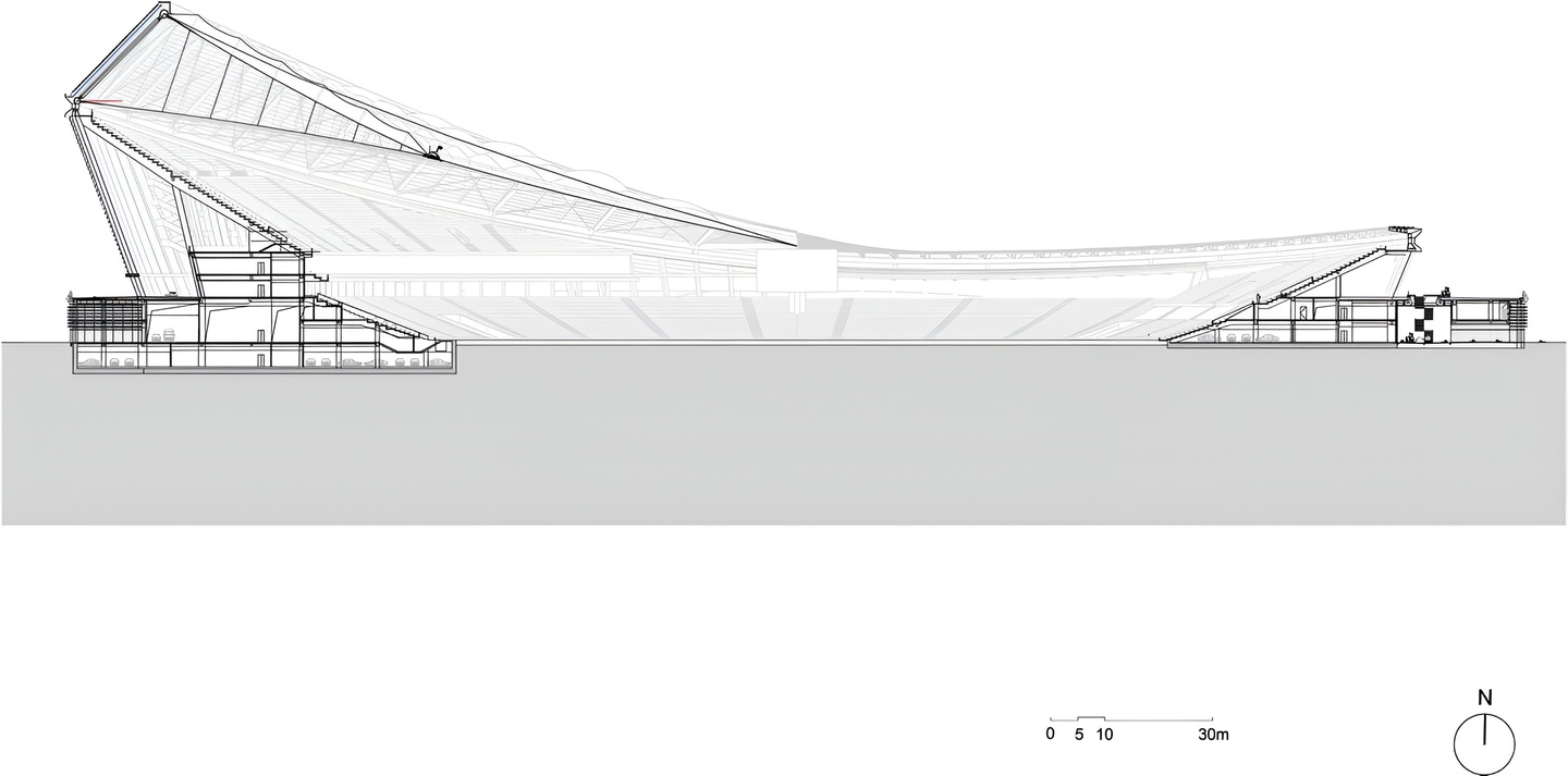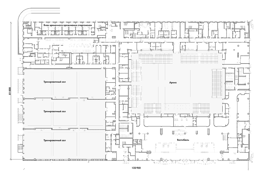Конструкция арены создана таким образом, что крыша опирается на каркасную систему с пролетами около 70 м. Это создает эффект открытого пространства, воздушности.