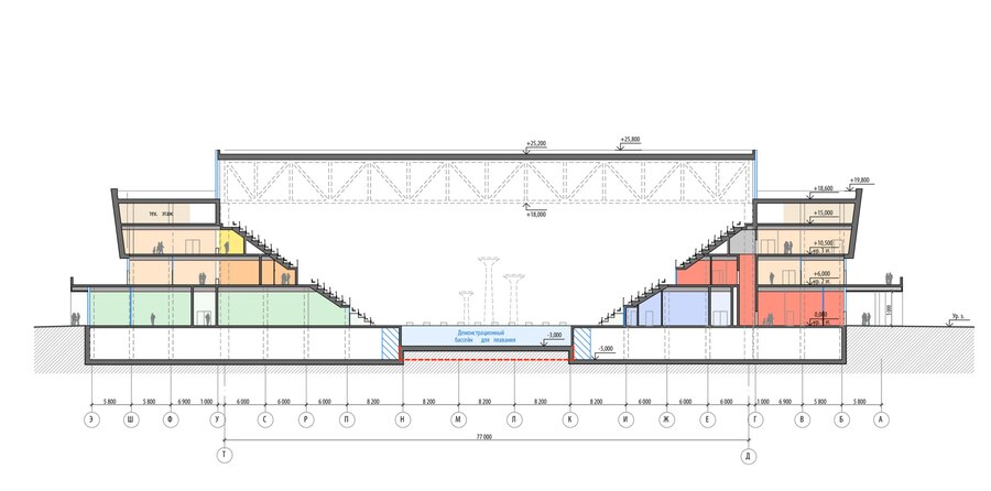 Основной идеей при создании комплекса являлось проектирование пространства, которое под одной крышей объединит в себе: места для соревнований по художественной гимнастики, залы для тренировок, помещения для хореографии, медицинский центр, гостиничные номера. Этот «дворец» не обычный зал, а многофункциональный комплекс, рассчитанный как для проведения массовых мероприятий, так и на ежедневные тренировки спортсменов.