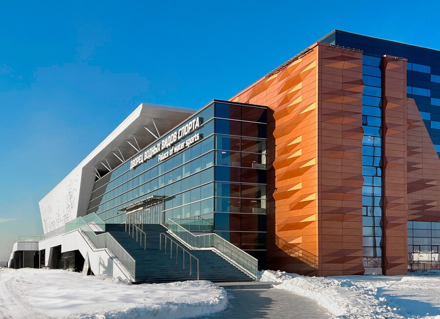 Дворец водных видов спорта в Екатеринбурге возвели во время подготовки к международному университетскому фестивалю. Открытие было в 2023 г. Данный комплекс рассчитан как на профессиональных спортсменов, так и на любителей. Его проектированием занималось бюро ARCHINFORM. Располагается он в «Деревне Универсады», специализированной зоне под спортивные сооружения. Центр спроектирован с учетом большой пропускной способности. Маршруты спортсменов, персонала и зрителей не пересекаются, что позволяет грамотно организовывать проведение массовых мероприятий. В здании имеется большое количество входов и выходов, что обеспечивает комфортное перемещение внутри здания и за его пределами. Трибуны на арене рассчитаны на 5000 зрителей.