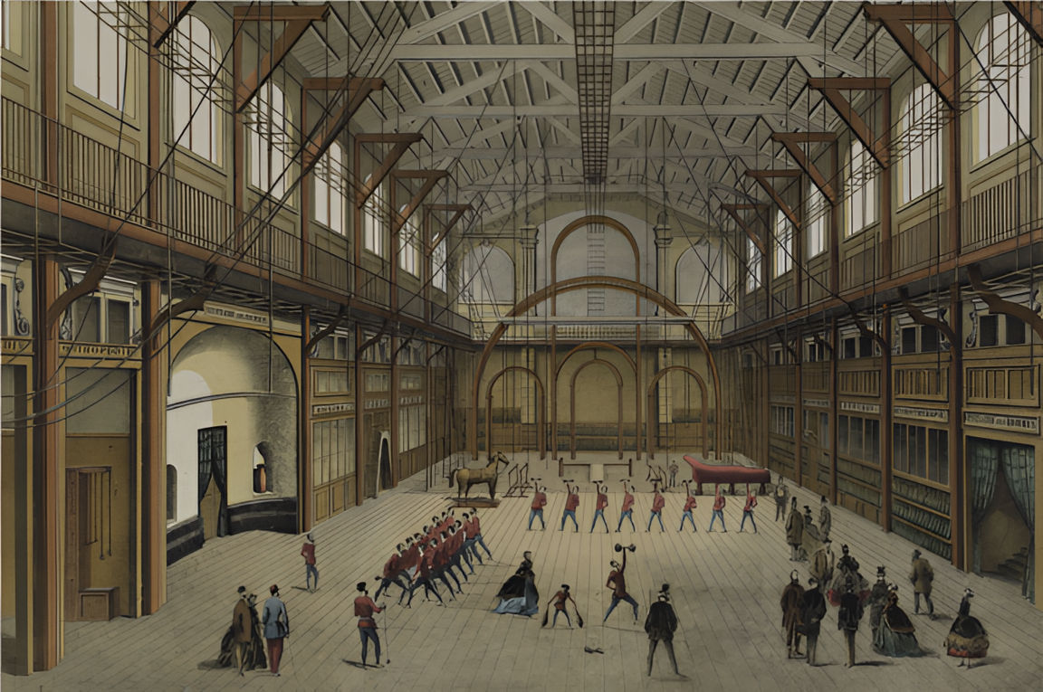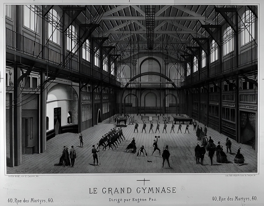 Gymnase Triat — это первый коммерческий спортивный зал, который был открыт для обычных людей. Его основной задачей было разностороннее развитие человека, здесь занимались не только атлетикой и военной подготовкой, но и гимнастикой. Это делалось, чтобы создать условия доступности спорта для всех, так как зал могли посещать как женщины, так и мужчины. Объекты, использовавшиеся в зале: штанги, канаты, снаряды, брусья, снаряжение для гимнастики и акробатики. Изначально Gymnase Triat находился в Брюсселе, Бельгии, но в 1848 году он был перенесет в Париж. Площадь помещения составляла 9500 квадратных метров.
