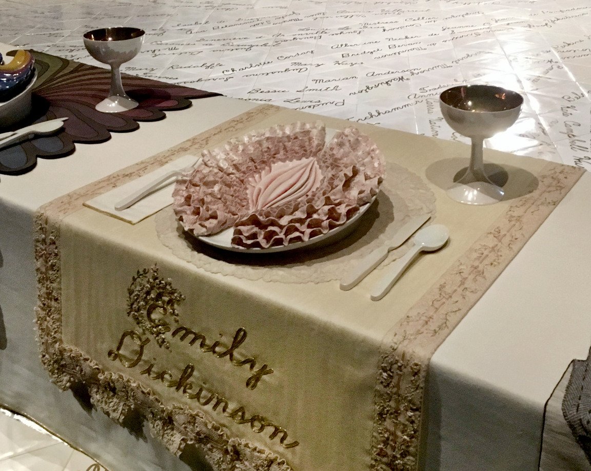 На столе стояли блюда с изображениями, похожими на женские половые органы. На салфетках были вручную вышиты имена. Художница визуализировала исключения по половому признаку.