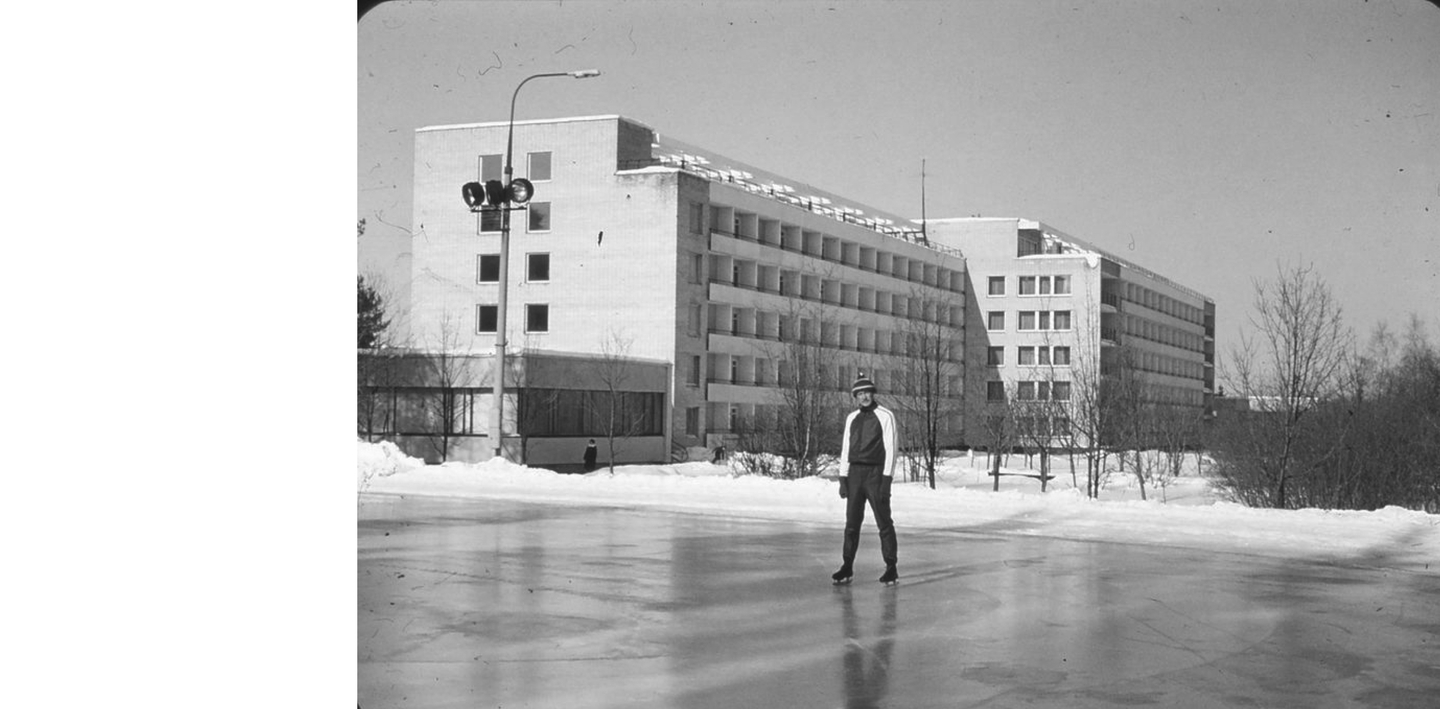 1. Вид на жилой корпус пансионата «Клязьма» // Д. Н. Баринов // 1973 г. // 2. Вид на жилой корпус и входную группу оздоровительного комплекса «Клязьма» // 2023 г.