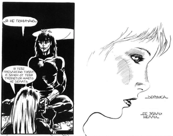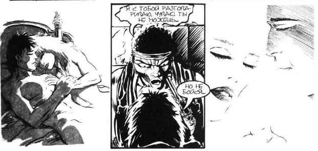 6. Функция кадров: постерность проявляется в том, что каждый кадр фиксирует героя как икону страдания и возмездия, превращая боль в универсальный символ. Конфликт возникает между черно-белыми (особенно темными) сценами мести и светлыми воспоминаниями о невесте Шелли (рис. 33 и 34). То есть создается визуальный дуализм «смерть и жизнь», а «тьма и свет» задают эмоциональную структуру комикса. Для читателя это становится эффектом созерцания трагедии как чего-то романтизированого через функцию постерности и на грани конфликта.