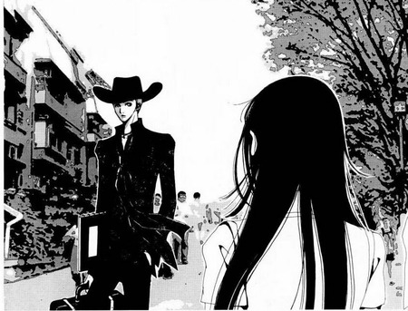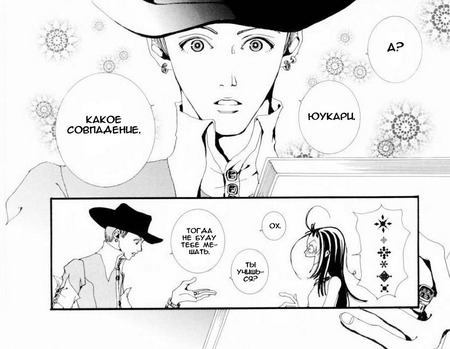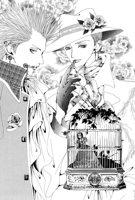 1. Определение кластера: персонажи в манге регулярно меняют костюмы, однако их базовая визуальная идентичность остается постоянной и выстраивается вокруг кода готического направления с элементами панка. Например, Джордж Коизуми одет в длинную темную рубашку с галстуком и обтягивающие брюки, а также такую же темную шляпу с полями (рис. 36). Все это относит его внешний вид к типу готической эстетики. На шее у него представлена цепь и проколоты уши в нескольких местах, что больше отсылает к атрибутам декоративного траура, что также приближено к готам. А вот персонаж Араши Нагасэ при первой встрече с главной героиней Юукари Хаясаки (Каролин) одет в футболку и джинсы (рис. 37). Не только на самой футболке, но и на лице у него есть проколы с булавками (у рта и над бровью), от которых идут цепи и множественный пирсинг в ушах. На шее у него находится кожаный чокер с большим кольцом спереди. Также у него кожаный ремень с металлическими вставками и большие кожаные темные сапоги. Его внешний вид относится к панкам или точнее стрит-направлению.