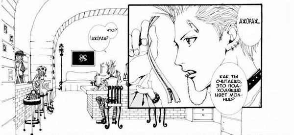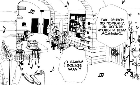 5. Степень репрезентации: в манге преобладает стилизация. Пространства и предметы модной среды (швейные машинки, помещения) показаны с узнаваемыми деталями, но без однозначного стремления к реалистичности (рис. 40). Герои изображены как модели, а не обычные люди, а воздух и позы создают ощущение глянца (рис. 43). Реальные вещи превращаются в символы стиля и свободы, формируя идеализированный образ мира моды, в том числе в рамках рассматриваемых кластеров готов и панков.