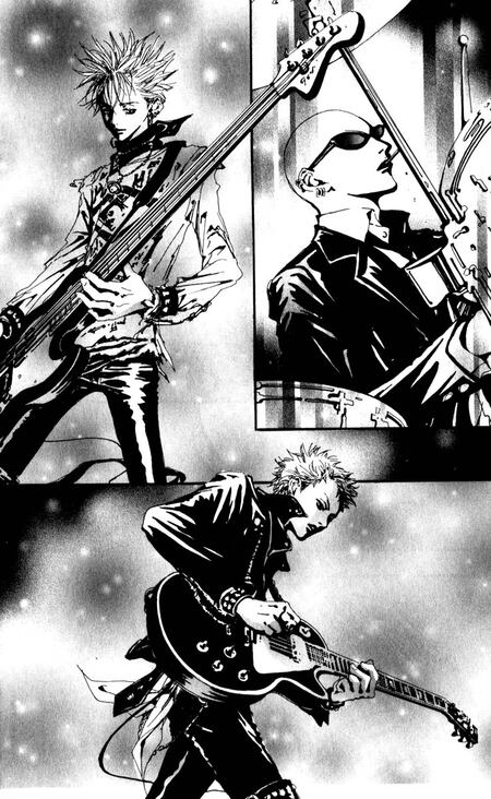 6. Функция кадров: за счет данных фреймов читатель знакомится с группой Blast. Он видит их концерт, количество людей, восторг толпы. Все это создает «вау-эффект» (функция постерности) для изображения «популярной музыкальной группы», поэтому здесь применяется именно постерность, то есть кадры нацелены на создание образа. Этот эффект достигается через использование субкультурных кодов на пересечении готов и панков.
