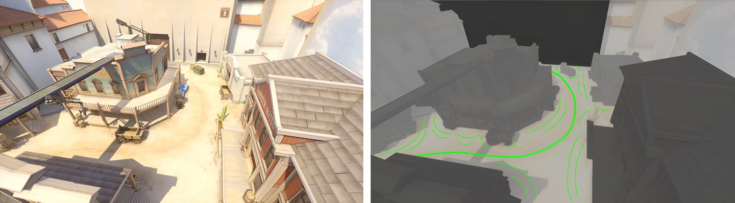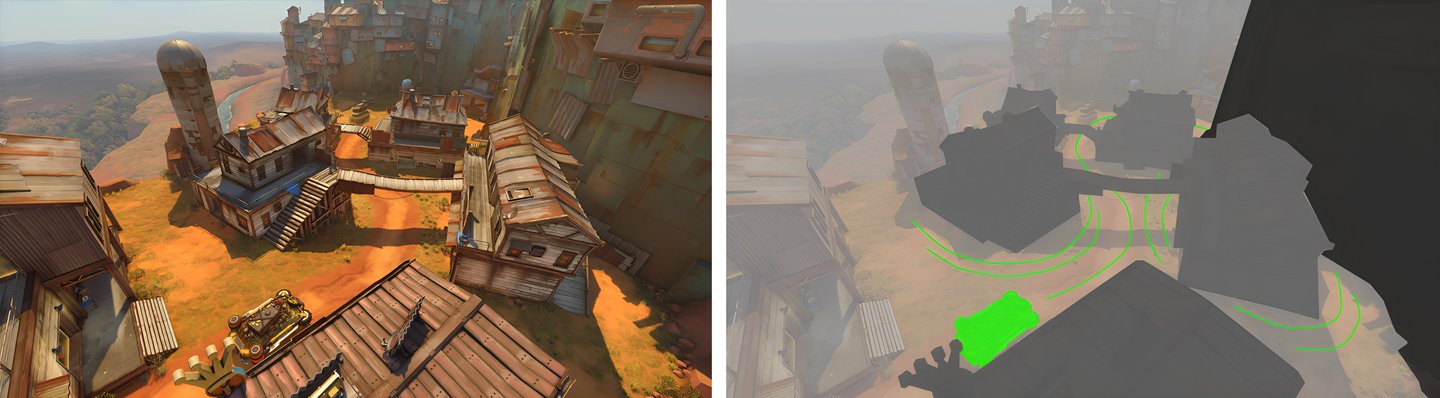 Например, в Overwatch крупные объёмы и здания формируют последовательность «позитивных» пространств, по которым движется игрок. В такой конфигурации сами строения направляют движение — и игрока, и переносимого груза — мягко смещая траекторию в сторону изогнутой линии.