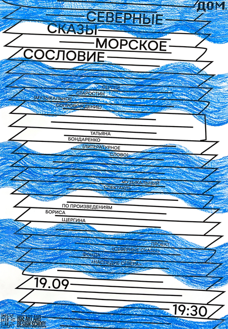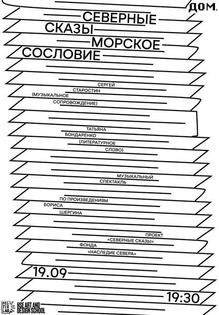 The poster is based on a phrase from Boris Shergin’s work «to stom it.» The black and white base of the poster is vertical, it sets the rhythmic motive for stitches and stitches. And the horizontal waves on top of the oil paste set a new direction for the composition, creating a feeling of wave swinging, sailing under the sails, or maybe a sailor’s steak.