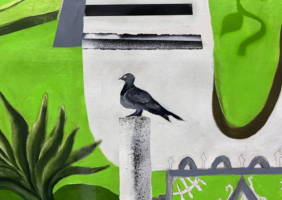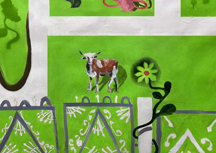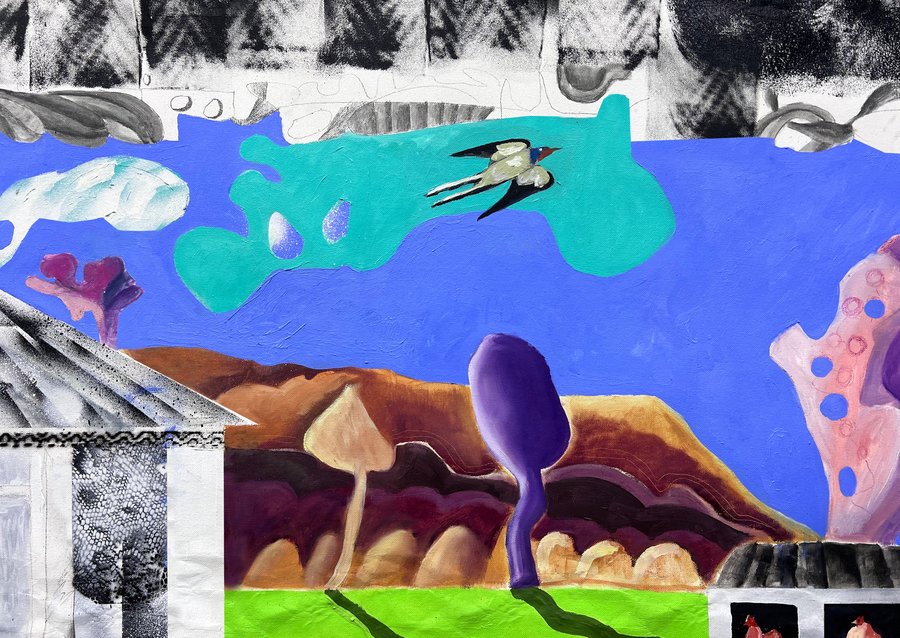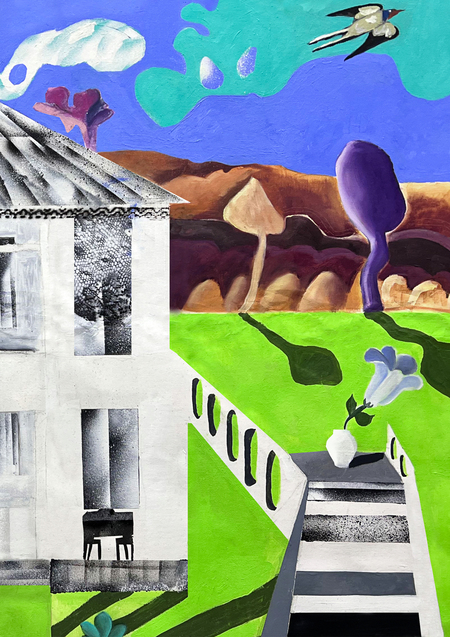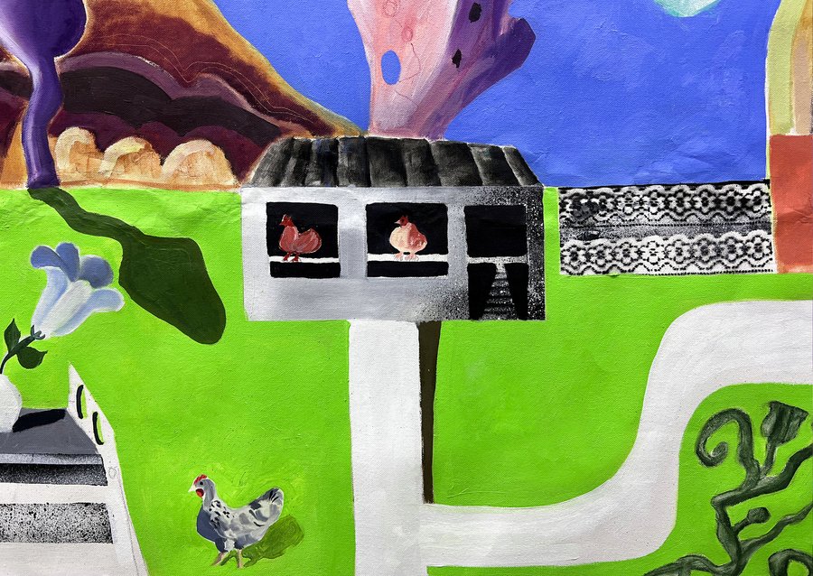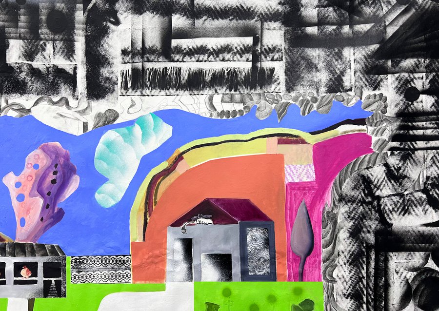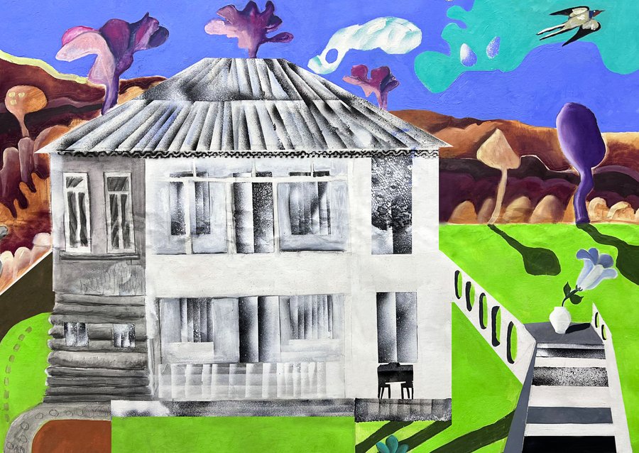 На фоне этого внешнего хаоса возникает мой внутренний порядок — дом в Ткварчале. Дом, в котором я вырос у дяди и тети. Я отделяю его окантовкой, рамкой. Это моя попытка создать границу между тем, что ранит, и тем, что даёт покой. Я создаю себе зону, где можно быть, не отбиваясь. Я думаю, что у каждого человека есть что-то своё: место, человек, звук, путь — своя форма устойчивости.