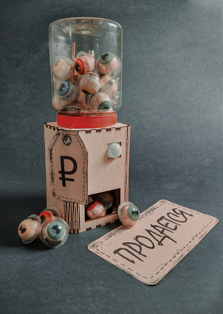 «Шар» — это общая тема группы. Мы выбрали идею сделать автомат с двигающимися мармеладными глазами. Этот объект интересен тем, что в нем присутствует полное взаимодействие со зрителем. С помощью программы Arduino и датчика движения глаза начинают двигаться при приближении к автомату. Дополнительным взаимодействием станет то, что зритель сможет получить конфету, а после ее попробовать.