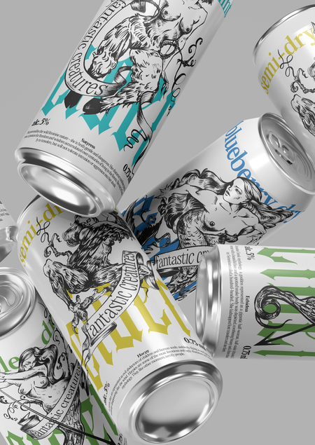 Дизайн упаковки сидра Fantastic creatures, вдохновлен гравюрами Альбрехта Дюрера. На этикетках изображены несколько фантастических существ женского пола: русалка, ехидна, сатиресса и гарпия