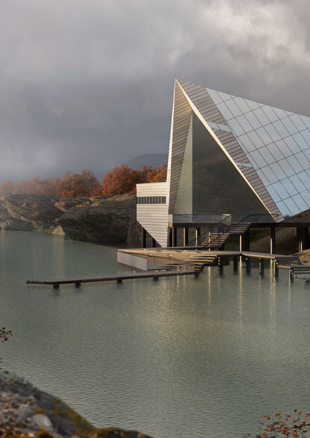 Согласно концепции, блюда подаются в виде драгоценных камней и минералов, поэтому фасад выполнен в стиле деконструктивизм и представляет собой визуально неограненный минерал.