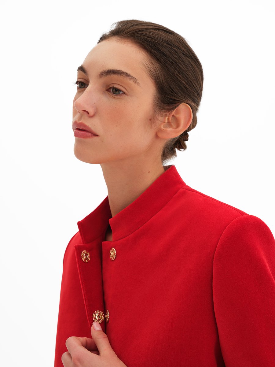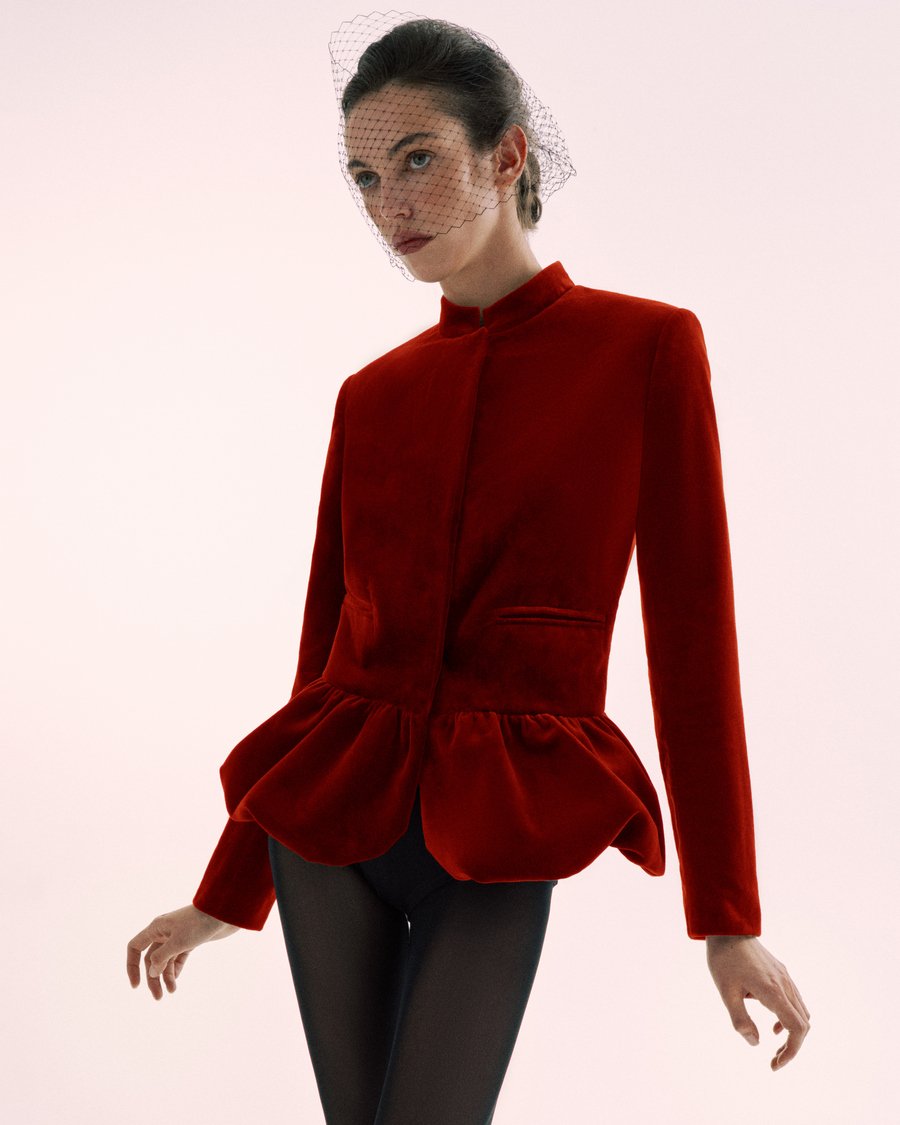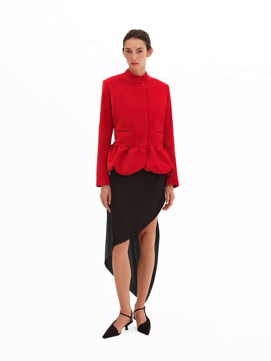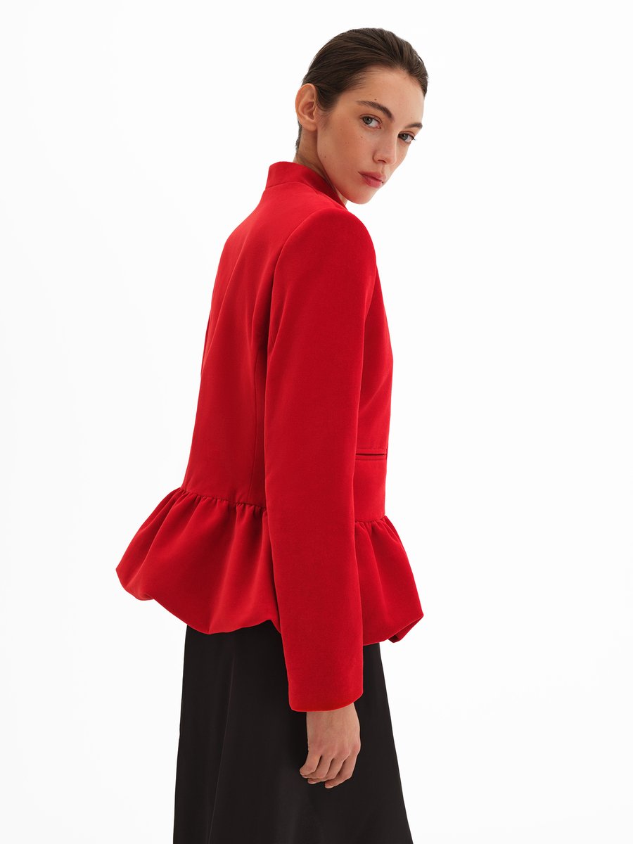 Жакет с баской SCARLET Акцентная вещь с характером, которая держит форму и внимание Изготовлена из итальянского бархата в насыщенном красном оттенке.