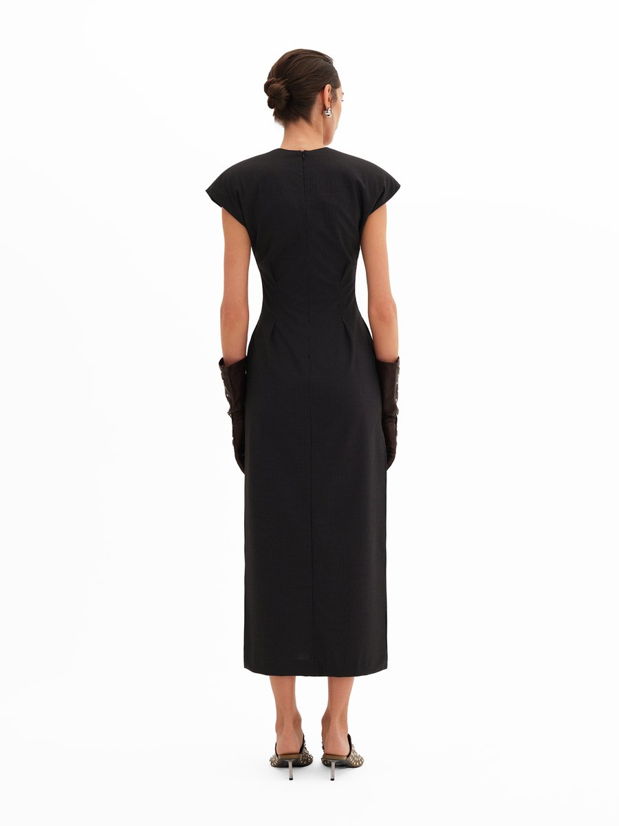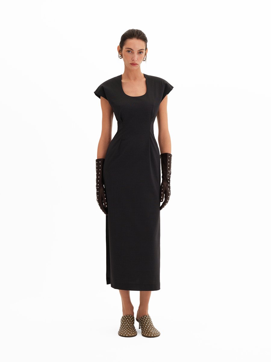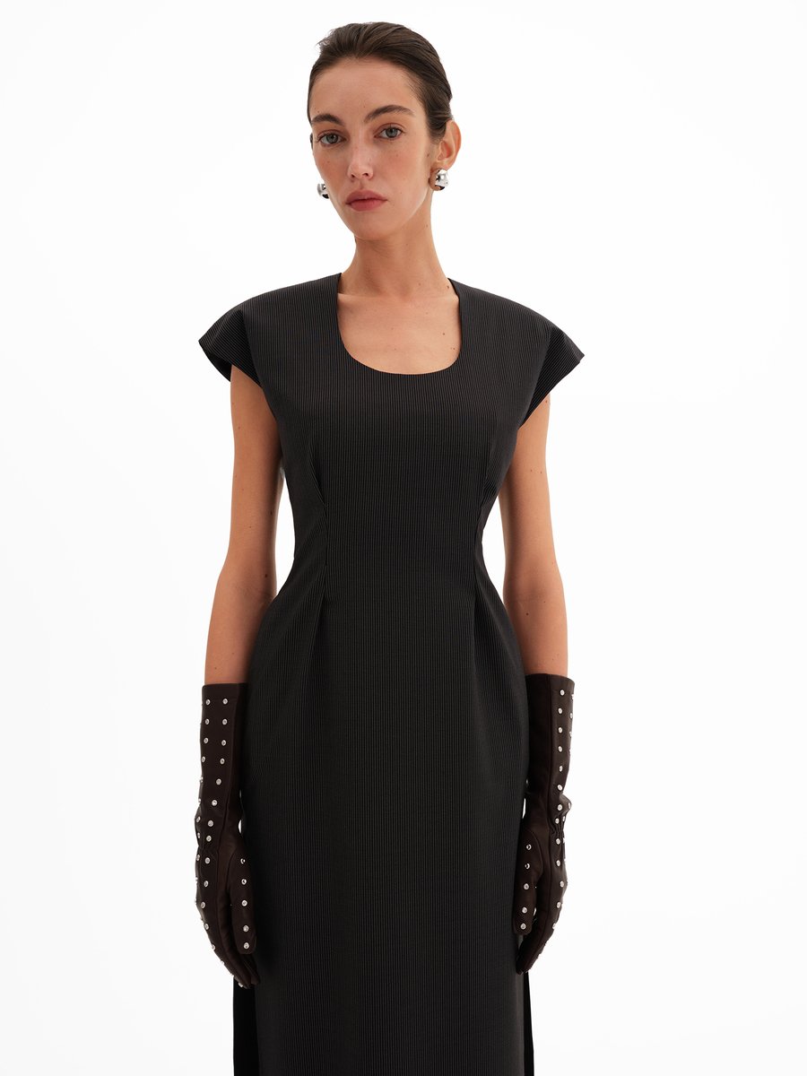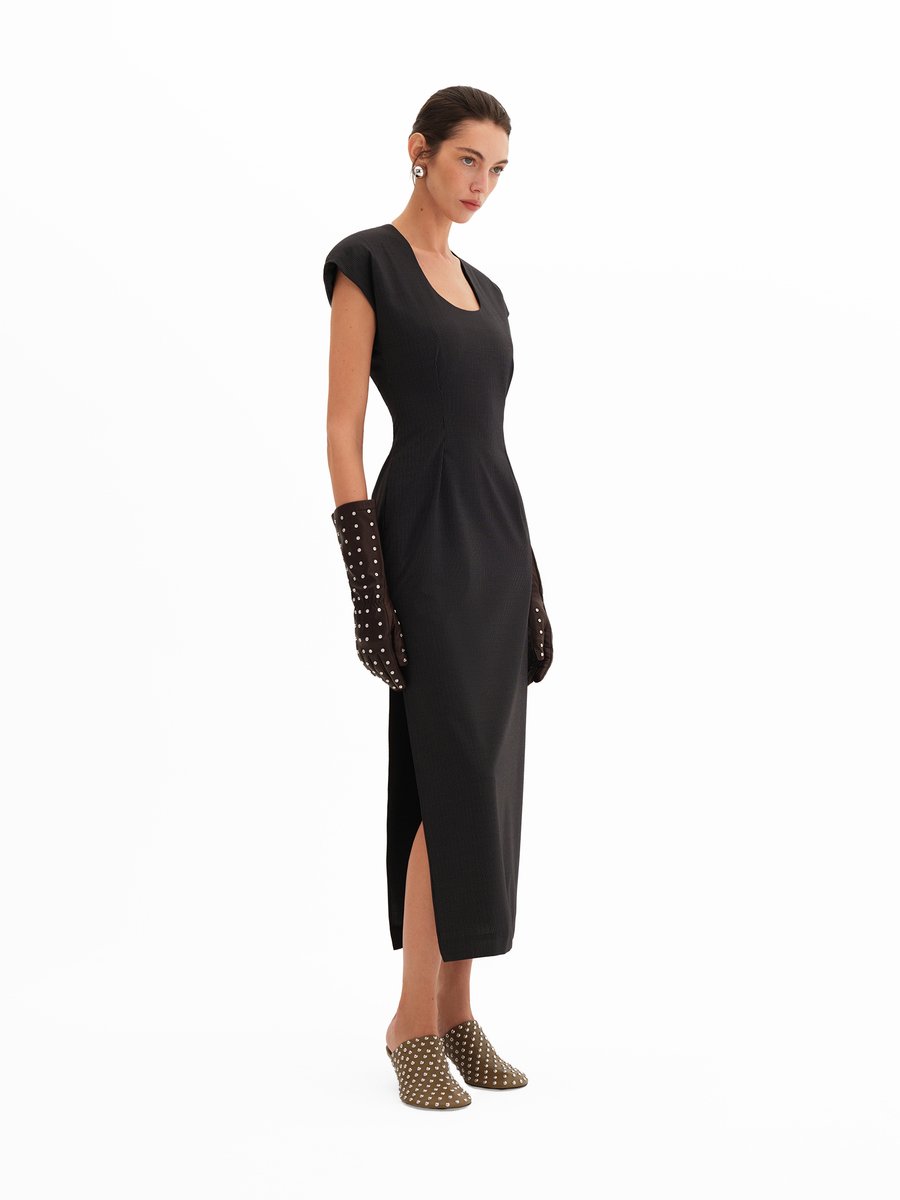 Платье с плечами MARIANO Модель визуально вытягивает силуэт и легко вписывается в деловой ритм. Аккуратные плечевые накладки создают чёткую линию плеч, а боковые разрезы добавляют свободы в движении.