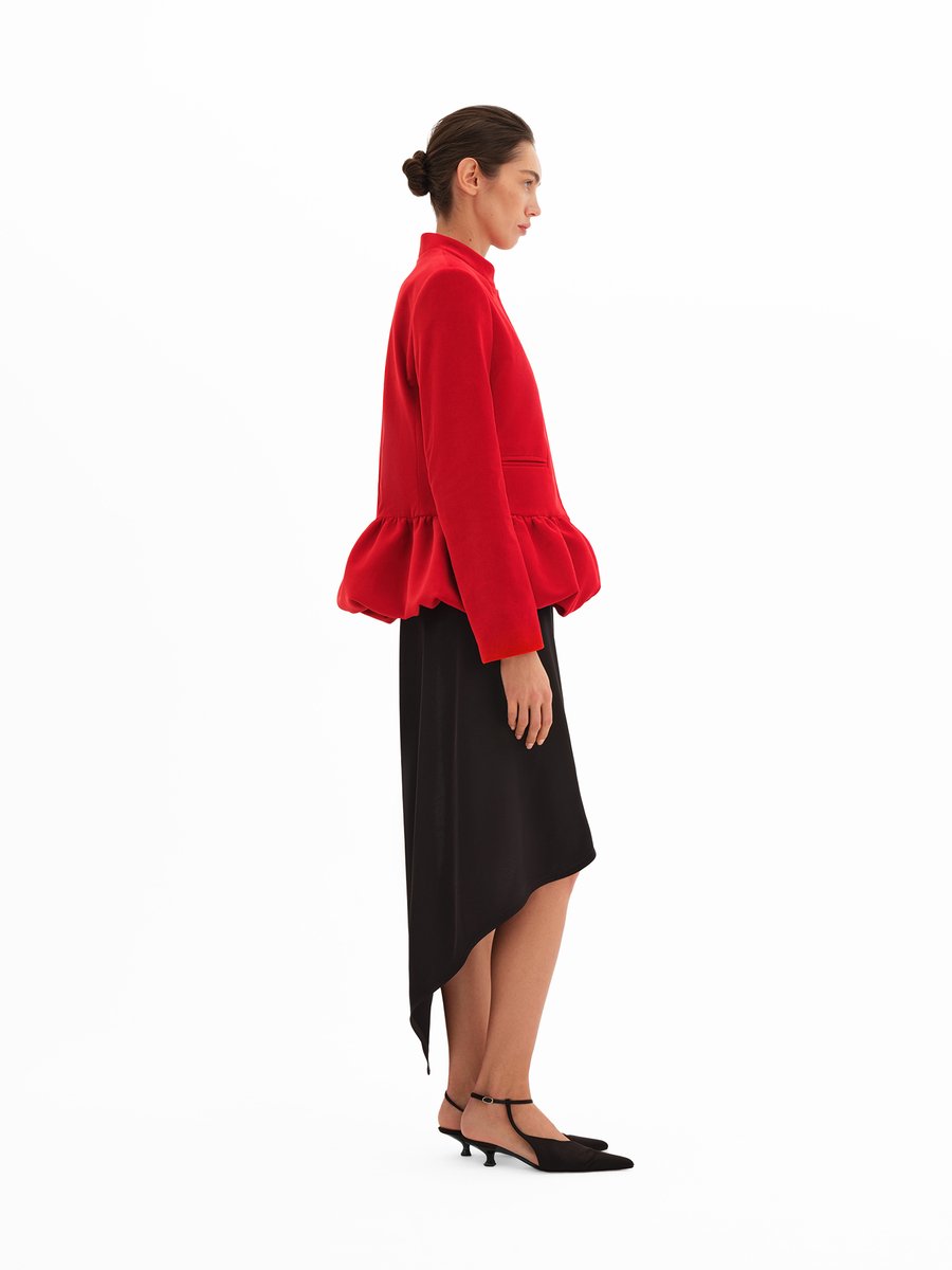 Жакет с баской SCARLET Акцентная вещь с характером, которая держит форму и внимание. Изготовлена из итальянского бархата в насыщенном красном оттенке.