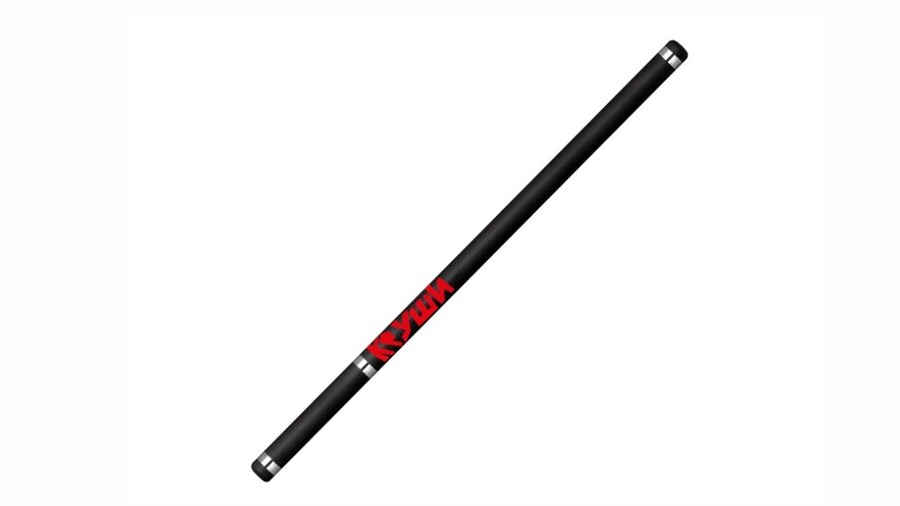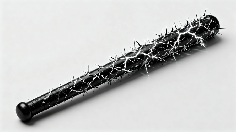 A product mockup of a single straight police baton (tactical baton) lying on a light gray background. The entire cylindrical surface of the baton is covered with a chaotic, intricate, sharp pattern of jagged and vibrating black lines, resembling frozen static discharge, interference, or energy cracks. The pattern is intense and creates a sense of optical vibration along the length of the object. Monochrome, high contrast, clean, minimalist graphic design style. Studio lighting, sharp focus, ultra-detailed, 8k. The design conveys controlled force, direct action, and contained energy, without any spikes or aggressive embellishments.