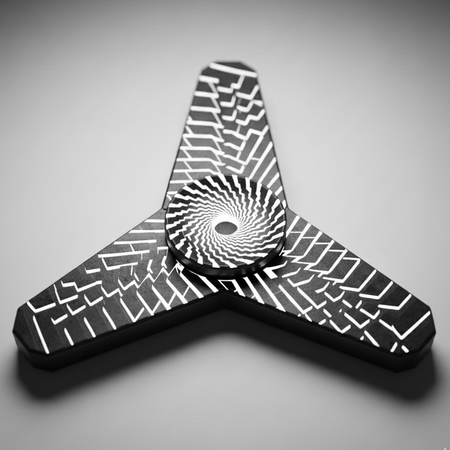 Объект: Геометричный спиннер с тремя или более симметричными лопастями. Форма лопастей может быть прямоугольной, шестигранной или в виде удлинённых треугольников, что отсылает к строгости предыдущих инструментов. Ключевой визуальный элемент (Поверхность): Каждая плоская грань спиннера покрыта интенсивным, угловатым узором из чёрных, вибрирующих линий. Узор должен обладать следующими свойствами: Оптическая динамика в статике: Линии расположены так, чтобы создавать иллюзию вращения или смещения даже когда объект неподвижен. Например, линии могут расходиться от центра к краям лопастей или закручиваться по спирали. Сгущение к центру: В центре спиннера (в подшипниковом узле) линии становятся максимально плотными и хаотичными, образуя тёмный «узел» или «вихрь». Это символический эпицентр энергии.