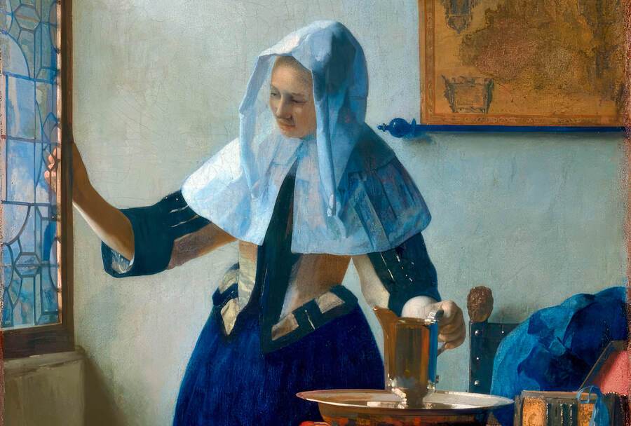 Для получения синего цвета Ян Вермеер берет ляпис-лазурь. Но поскольку краска эта очень дорогая, она кладётся только на самый верхний слой; для нижнего слоя используется азурит или смальта (в частности, когда изображается небо), реже — индиго.