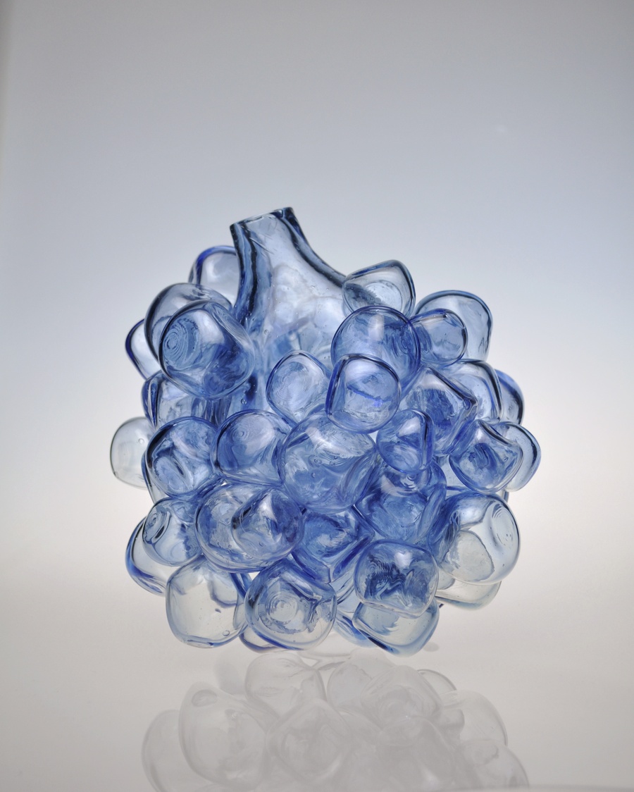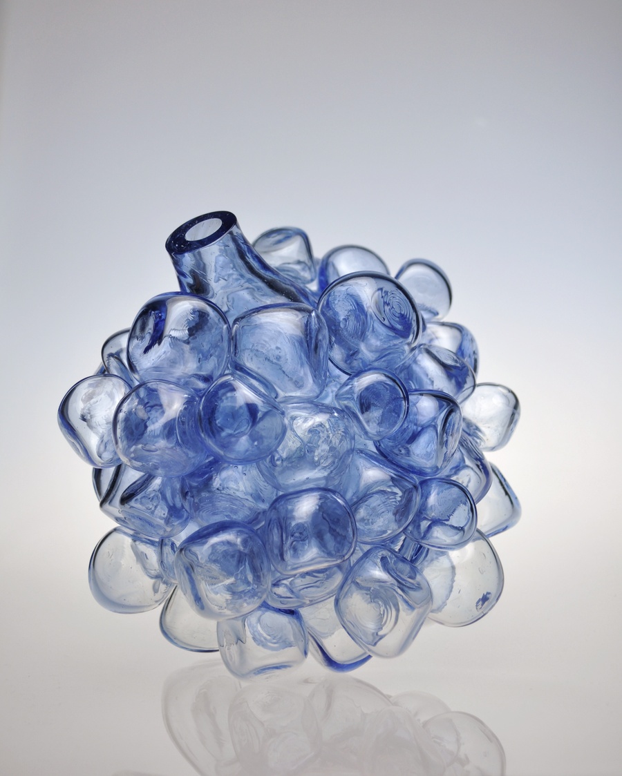 For my work I used hand-recycled bottle glass. All elements for the vase were also hand-made. The blowing technique from the Glass Knight studio, blowing in an open flame of a torch using the lampwork technique, sintering and annealing in a kiln, and ultraviolet gluing were used.