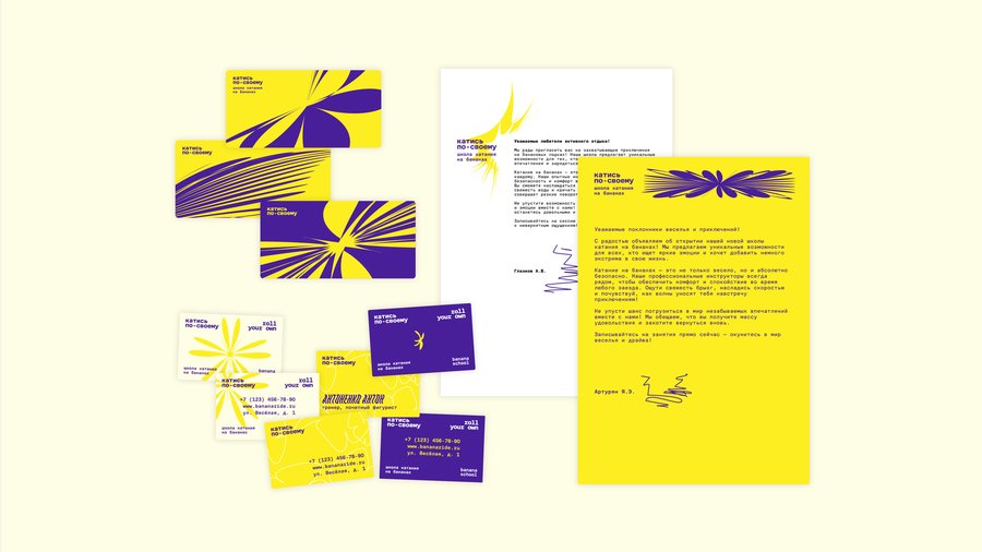 Логотип школы катания на бананах основан на идее индивидуальности, заложенной в словах «по‑своему». Он стал динамичным, чтобы передавать движение и легко подстраиваться под различные форматы. Каждый выбирает свою уникальную траекторию, и логотип отражает эту идею.