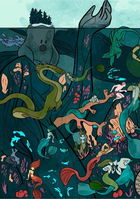 Третий разворот это изображение глубин моря у замка целиком плоскостно.
