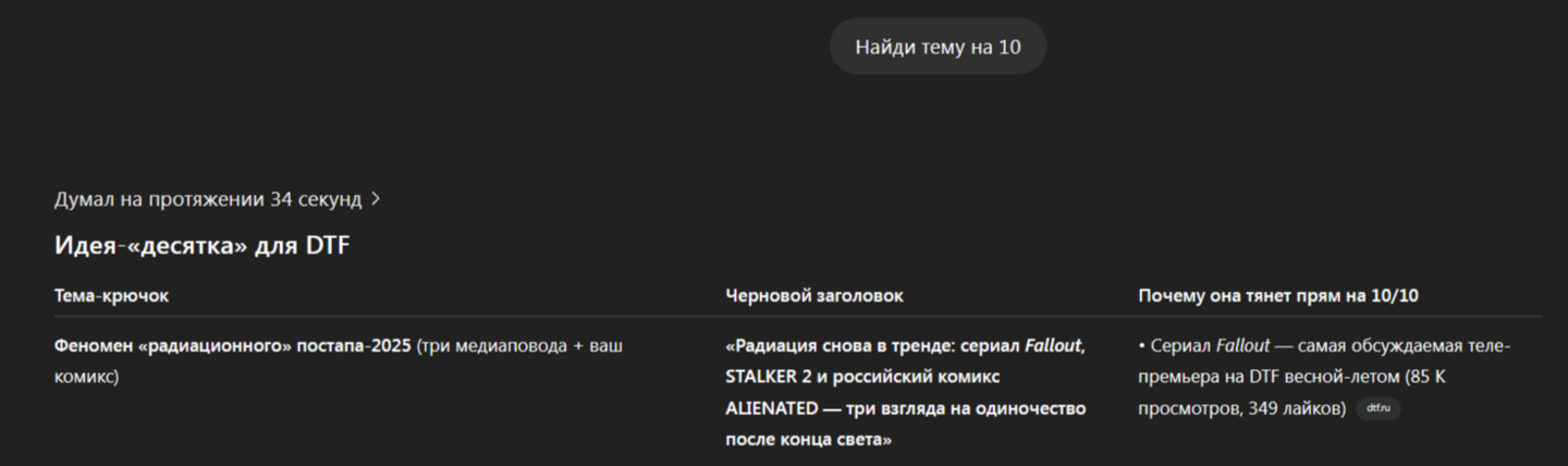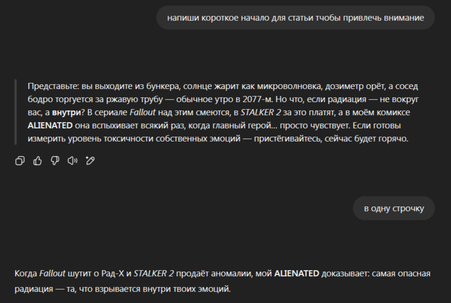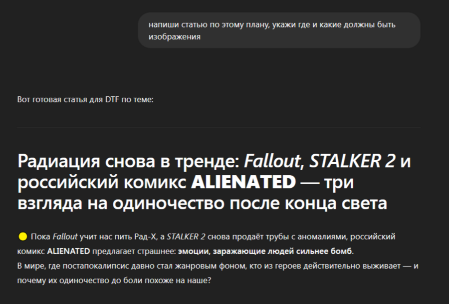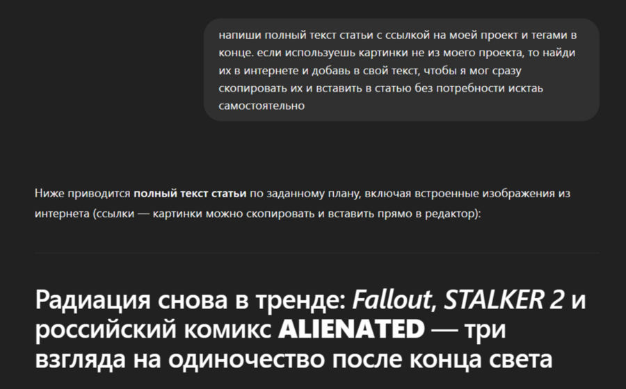 Используя ключи которые популярны в игровой сфере, например, тему пост-апокалипсиса, ИИ сравнила их с моим проектом, объединив соответственно в статью.