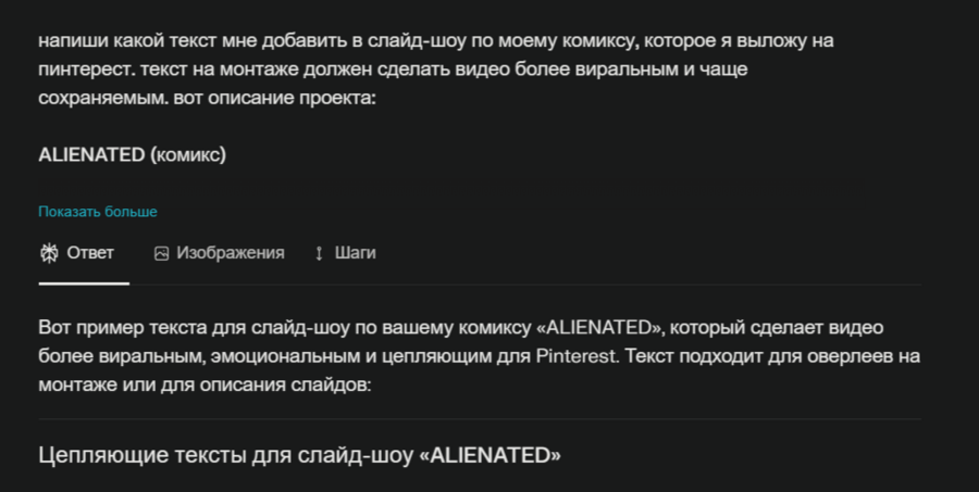 Видео я загрузила на Pinterest, сгенерировав преимущественно текст для него (вышло не очень по теме, но достаточно близко).