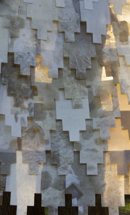 Rhythmically arranged details, associatively reminiscent of the tightly folded domes of northern churches, are not fastened together and are subject to any movement of the surrounding space, be it the wind or a person’s touch. This symbolizes the loss of supports in the previously unshakable.