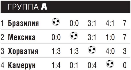 Неубедительно выглядели хозяева и во втором матче — с Мексикой, хотя по статистике должны были побеждать с солидным перевесом. Однако мексиканский вратарь Очоа свел на нет все усилия бразильских игроков — 0:0. В последнем значимом матче Мексика обыграла безвольных хорватов и седьмой раз подряд вышла в плей-офф. Камерун во главе с Самуэлем Это’О был бит всеми подряд.