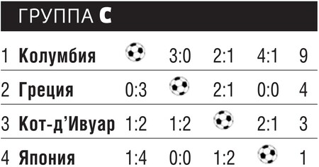 Колумбийцы, в рядах которых выделялся Хамес Родригес, просто не заметили оппонентов. Помучаться им пришлось лишь со сборной Кот-д’Ивуара, использовавшей в качестве палочки-выручалочки бессменного Дрогба. 36-летний нападающий вышел на поле за полчаса до окончания матча, но колумбийцам так и не забил. В решающем матче с греками Дрогба, напротив, появился в стартовом составе и был заменен за 12 минут до конца матча при комфортном для африканцев счете 1:1. Но на второй добавленной к основному времени минуте ситуация кардинально изменилась: греки получили право на 11-метровый! Точный удар Самараса похоронил надежды ивуарийцев на продолжение борьбы.