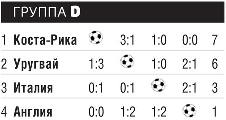 В «группе смерти» выжили те, кого никто не принимал во внимание — сборная Коста-Рики. В первом матче они вырвали волевую победу у уругвайцев, которых явно успокоил реализованный Кавани пенальти. Затем сенсационно обыграли итальянцев: за минуту до перерыва мяч забил нападающий Руис.