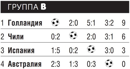 По окончании матчей в группе B чемпионский трон опустел, поскольку сборная Испании досрочно сложила с себя это звание. Первые два матча, с командами Голландии и Чили, показали бедственное состояние «красной фурии», приехавшей в Бразилию в приевшемся за последние годы составе. Голландцы на их фоне выглядели инопланетянами, а физически выносливые чилийцы — несгибаемыми наследниками великих инков. На этот раз история повернула вспять: в борьбе за «золото» потомки гордого индейского племени взяли верх над прапраправнуками конкистадоров. Победа над Австралией со счетом 3:0 стала слабым утешением для испанцев, поскольку не значила ровно ничего.