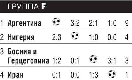 Дебютанты мирового первенства — сборная Боснии и Герцеговины — потеряли всякие шансы на успех после того как проиграли нигерийцам. В матче примерно равных по силе команд преимущество, как правило, получает более опытный соперник. Боснийцы, создав несколько острых моментов у ворот африканцев, так и не сумели ими воспользоваться. Нигерийцы, с первых минут принявшиеся обстреливать ворота соперника издали, свой шанс реализовали. А в игре с аргентинцами, влиявшей лишь на итоговое распределение мест в группе, продемонстрировали умение отвечать ударом на удар. Игрок российского ЦСКА Ахмед Муса дважды сравнивал результат после голов Месси, но отыграть еще один мяч — от Рохо — уже не смог.