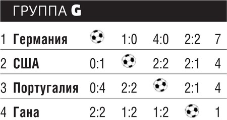 Хорошо обученные немецким тренером Юргеном Клинсманом американцы отчаянно бились со сборной Германии под ливнем в Ресифи. После пропущенного на 55-й минуте гола их больше интересовал результат шедшего параллельно матча Португалия — Гана, в котором вели в счете европейцы. Ответный гол Асамоа Гьяна поднял им настроение, которое не испортил даже точный удар Роналду. Имевшийся у американцев запас прочности был слишком велик.