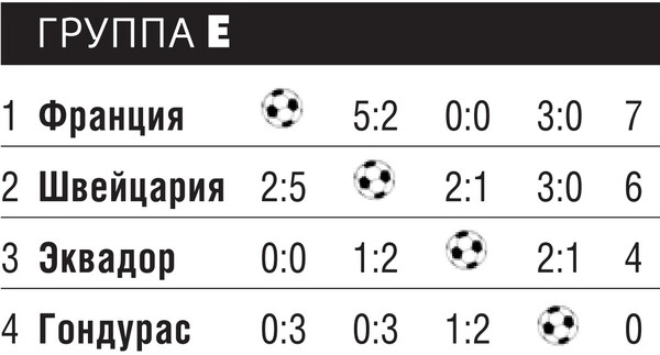 Французы красиво выиграли два первых матча, заранее сняв все вопросы о том, кто в группе сильнейший. Особенно впечатлила специалистов победа над швейцарцами: до 81-й минуты счет был 5:0, и только под занавес матча «трехцветные» позволили себе немного расслабиться. Отличное взаимопонимание показывали Бензема и Вальбуэна, при стандартных положениях на высоте был Жиру, в воротах уверенно чувствовал себя Льорис.