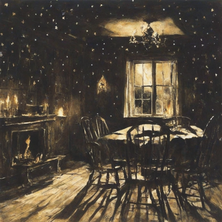 промт картинки слева — «a dark night, an empty living room, a table and four empty chairs around, stars are outside the window» промт картинки справа — «portrait of a young girl»