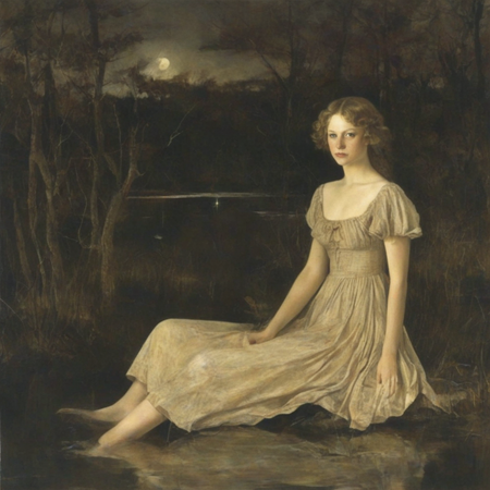промт картинки слева — «portrait of a young lady, she is wearing a beige light dress, surrounded by forest, night, the moon» промт картинки справа — «portrait of a young guy sitting on the grass»