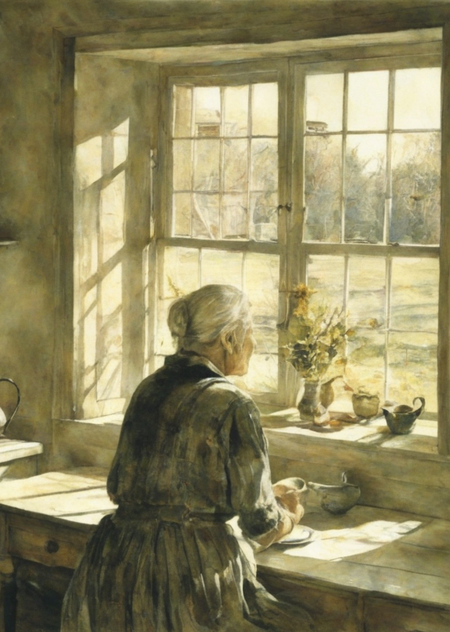 Изучить возможности генеративных нейросетей и создать атмосферную серию изображений, вдохновлённую работами Эндрю Уайетта.