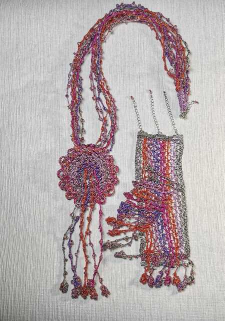 В работе: МН разных цветов и бисер № 6 (стекло). Изделия получаются легкими. Их утяжеляют доп. материалы. Браслет 170 Х 65 мм — 105 гр. Бусы 910 мм + 50 мм — 133 гр. Кулон 87 мм Х 130 мм — 74 гр. Апрель 2024 год. Тираж ограничен. Не продавала. Только выставки.