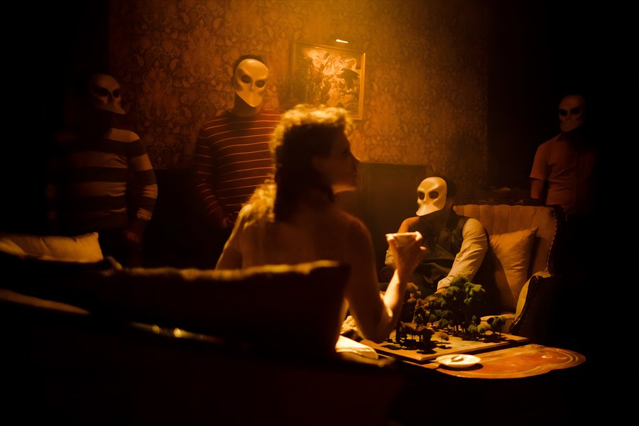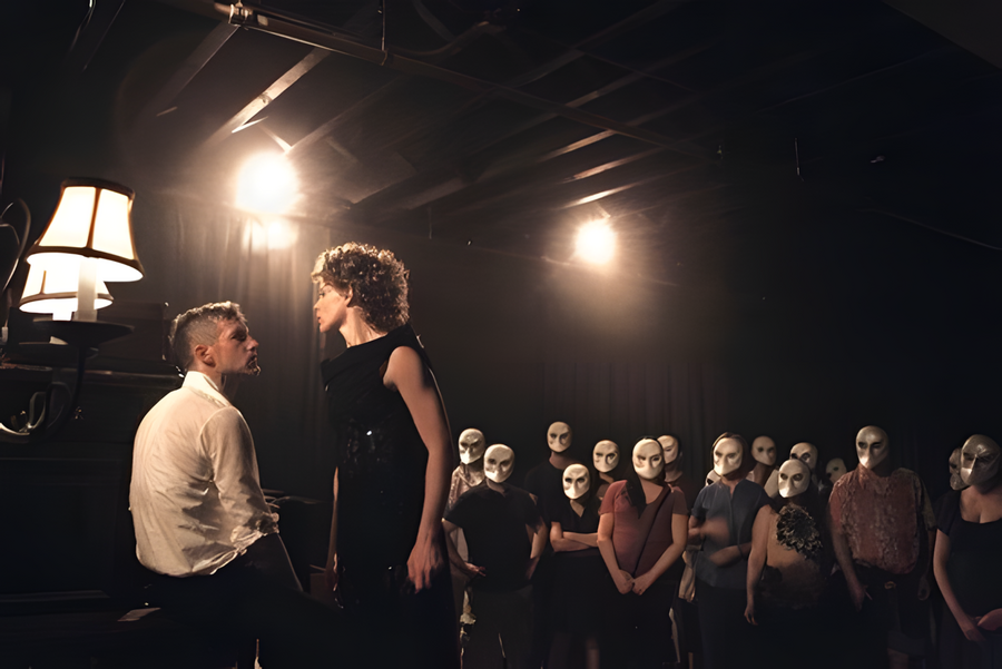 Пространство спектакля воссоздаёт отель 1930-х годов, превращённый в многоэтажный лабиринт. Комнаты — это не просто декорации, а метафоры фрагментированного сознания героини. Зритель как будто перемещается внутри её памяти. Поскольку все зрители ходят в масках, лицо Леди Макбет становится фокусом — оно «говорит» за весь зал. Она — единственная, кто видит и знает, остальные остаются тенями.