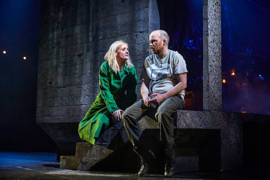 Остермайер помещает «Макбета» в индустриальный ангар, лишённый декора и символизма. Пол покрыт грязью, сцена напоминает зону боевых действий. Власть здесь не сакральна, а животная и грязная. Пространство работает не как фон, а как равноправный участник действия — гасит героев, втягивает в себя.