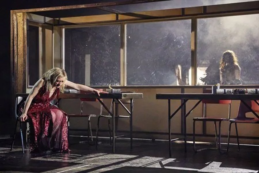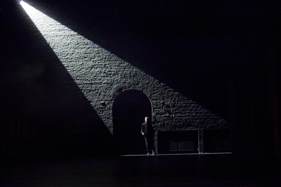 Постановка оформлена минималистично: практически пустая сцена, белые стены, нейтральный свет, подчёркивающий монохромность. Визуальная сдержанность делает любые движения персонажей особенно напряжёнными, почти болезненными. Пространство напоминает не замок, а лабораторию, где чувства подлежат вскрытию. Это подчёркивает психологическую природу действия: здесь царят не страсти, а внутренняя тревога и отчуждённость.