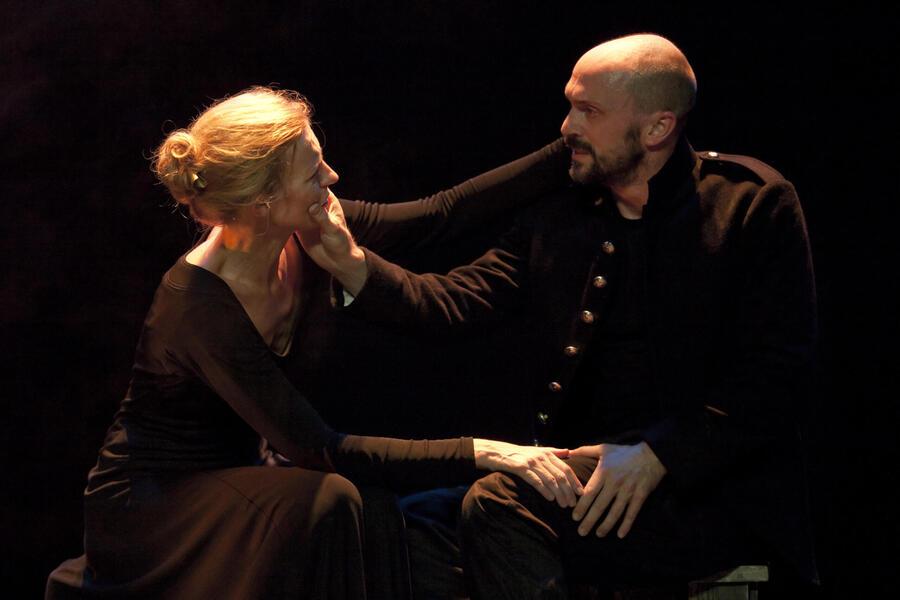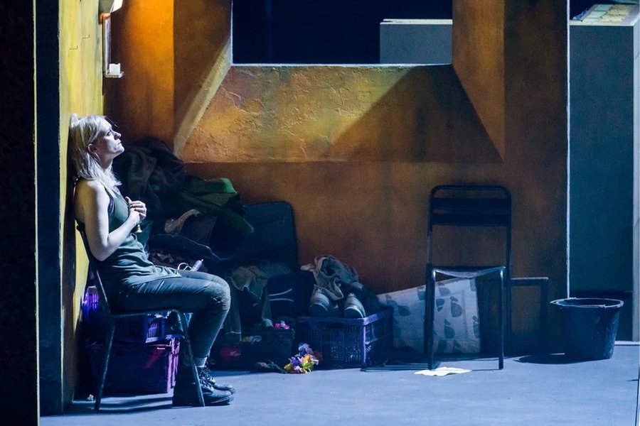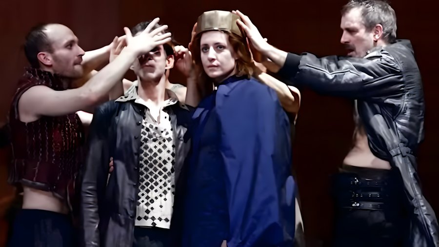 Ангела Винклер играет Леди Макбет как разрушенную фигуру. Её тело напряжено, движения сбивчивы, голос неуверен. Это не властная женщина, а героиня на грани срыва. Она больше страдает, чем управляет.